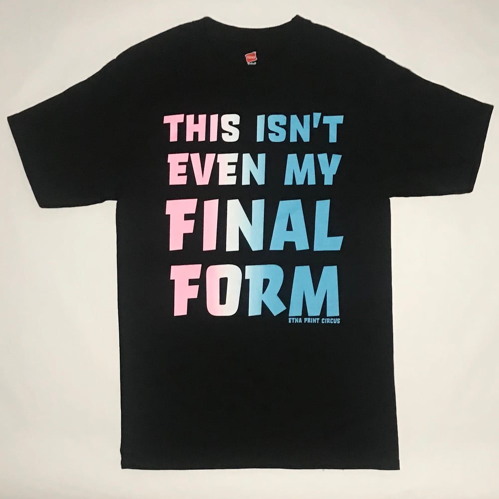 Heavyweight 100% cotton black t-shirts in a looser, classic fit, printed by trans hands with a gradient of pink, white, and blue ink. Every print is a little bit different—some have a more streaky/marbled look, and some are a more smooth blend, so send us a message if you want to see pictures of the specific shirts available in your size! (We think they all look pretty cool so if you want to be surprised, we’ll choose for you.)